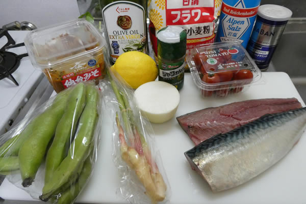 材料はこんな感じ。鯖のムニエルだけでは淋しいので、付け合わせに、谷中生姜・そら豆・ミニトマトと、賑やかにいきます。谷中生姜の味噌は、どんな味噌がいいのかわからないので、取り敢えず普通の味噌汁の味噌、ということで。
