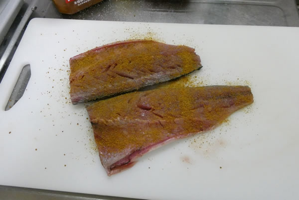 さて生鯖ですが、中骨を抜いて両面に塩・胡椒・カレーパウダーを振りかけます。カレーパウダーがメインなので、胡椒はいらないかも。