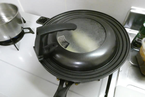 | 5. | ある程度焼けたら鯖を裏返して、フライパンに蓋をして蒸し焼きにする。 |