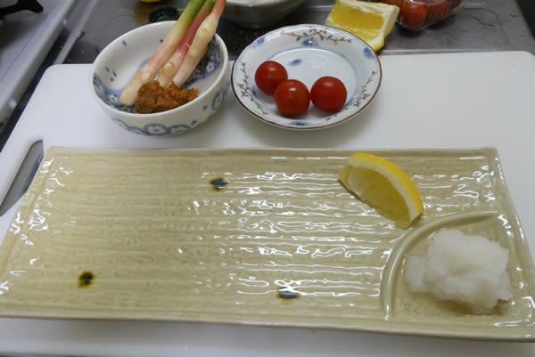 谷中生姜・ミニトマト、大根も下ろして、レモンも添えて、受け入れ態勢完了。
