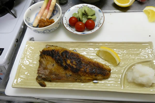 鯖が焼きあがったら、器に乗せて出来上がりです。ちょっとお焦げが気になりますが、まあいいでしょう。