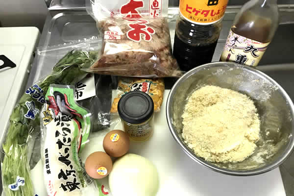 材料はこんな感じ。トンカツ用の豚肉が一枚余ったので、かつ丼でも作ってみようかという、軽い気持ちで向かっていきます。かつ丼で大切なのは何といってもタレですね、玉子とじ。 ちょっと甘味を感じるやつ。
