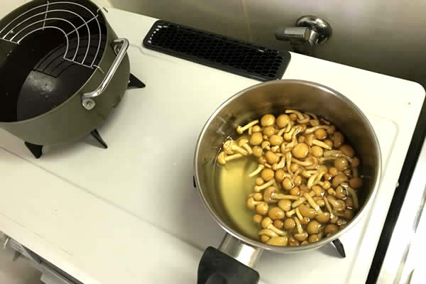 かつ丼のタレ用に出し汁を分けて、残りにさっと洗ったなめこを入れておきます。ついでに赤だし味噌も入れて、温めればいいだけの状態にして、この鍋は待機。横にトンカツまだかと、油鍋が待ち構えています。