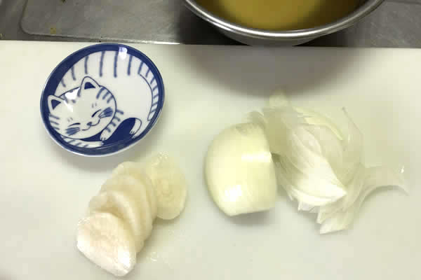 油が手ごろな温度になるまでに、玉ねぎを薄切りにして、べったら漬けも切っておきます。べったら漬けは洗わないでいいらしいです。袋の説明に書いてありました。お皿の猫ちゃんが、べったら漬けを待っています。ホントの猫にあげたら大変なことになります。そもそも食べないでしょうけど。