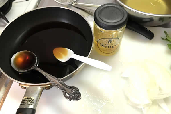 | 8. | だし汁と醤油とみりんと砂糖(はちみつ)を、丼ぶり用の鍋で混ぜ合わせる。 |