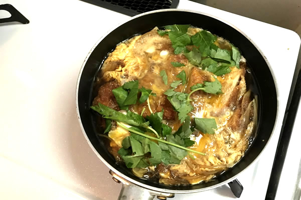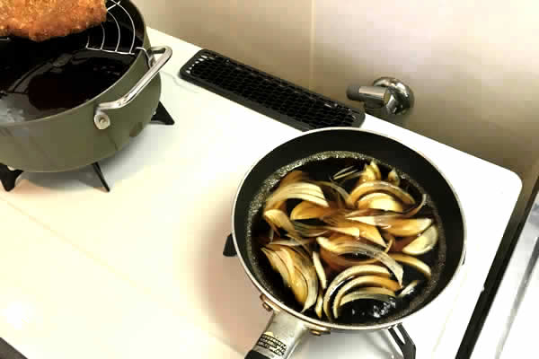 | 10. | タレが沸騰したら薄切り玉ねぎを入れ、少ししてからそこに揚げたてのトンカツを入れる。 |