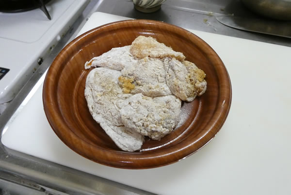 タレに漬けてあったあんこうに片栗粉をまぶして準備完了。面倒なのはここまでで、あとは揚げるだけの状態。一番楽しいひと時。