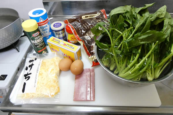 | 2. | ほうれん草を茹でて適当な大きさに切り、ベーコンは細切りにする。 |
