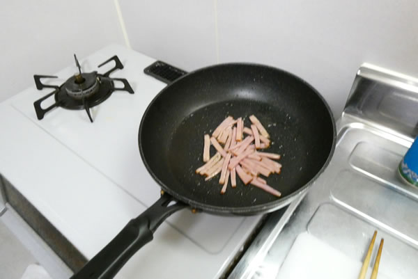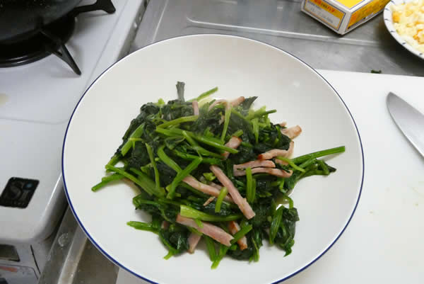 | 3. | フライパンを熱してオリーブオイルをひき、ベーコンを炒め、次に茹でたほうれん草を足してバターを加え、塩・胡椒と茹で溶かした顆粒コンソメで味付けをする。 |
