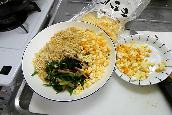 ほうれん草の準備もできて、ベーコンは細切りにして、ゆで卵はみじん切りにします。これで下準備完了です。