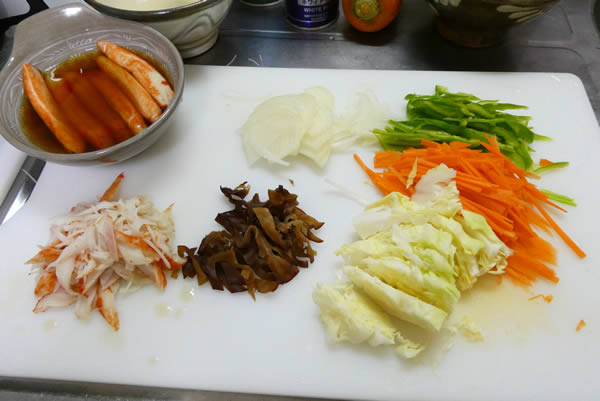 | 3. | ビーフンを茹でている間に、きくらげ・キャベツ・ピーマン・人参・玉ねぎを、好みの食べやすい大きさに切っておく。そして、タレに漬けてあったカニかまの半分を、これも好みの大きさに切っておく。 |