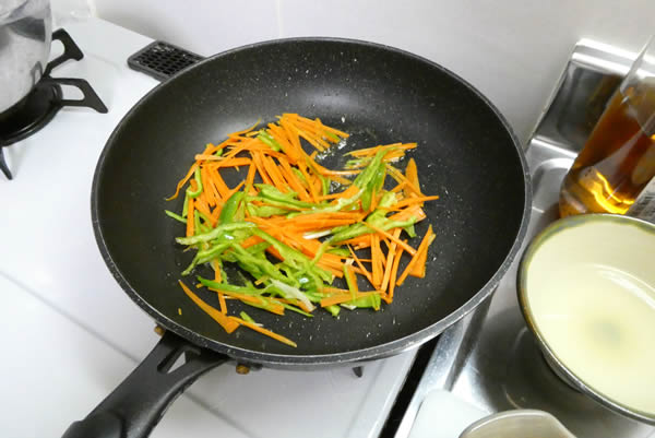 いよいよ開始。フライパンにごま油をひいて、まず人参とピーマンを炒めます。硬い具材から先です。