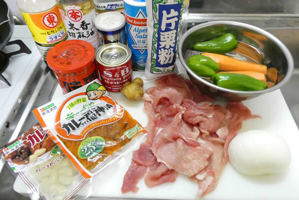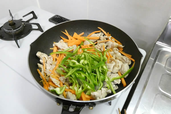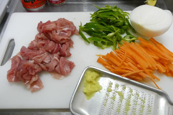 まず豚肉を食べやすい大きさに切り、人参・ピーマンは細切り、玉ねぎはスライスして、生姜をすりおろして、と。下準備はこれだけ。何か楽勝気分。
