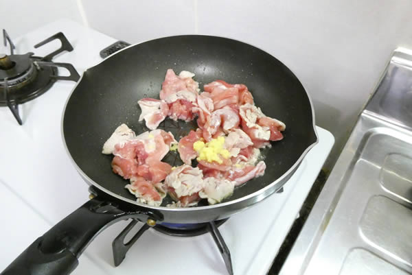 | 1. | フライパンを熱してごま油をひき、豚肉を生姜で炒め、軽く塩・胡椒を振りかける。 |