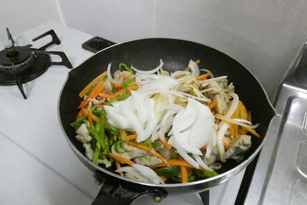次に玉ねぎをいれます。別に人参・ピーマンといっしょでもいいのに。硬い順から入れるクセがついているので。