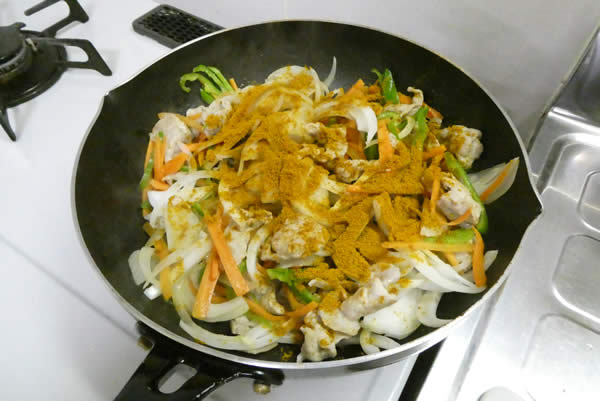 | 2. | 次に、細切りにした人参とピーマン・スライスした玉ねぎを加えて混ぜ合わせ、カレー粉を振りかけて、さらに混ぜ合わせる。 |