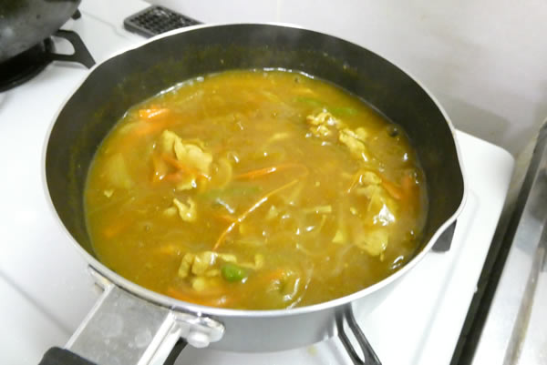 ここで中華味らしくするために、味覇をお湯で溶かして流し込みます。そしてここらが、味見三昧。塩・薄口しょう油、場合によっては、もう一度味覇。味が濃すぎたら水を足す。こんなことの繰り返し。胡椒は使いませんでした。カレー粉があるから、いいじゃないの