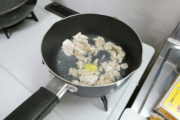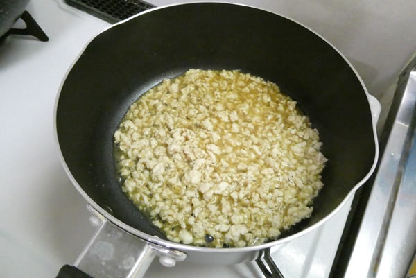 さて、本番スタートです。フライパンにオリーブオイルをひいて、残してあった鶏ひき肉を生姜で炒めます。木べらでほぐしながら、ひく肉が固まらないようにします。