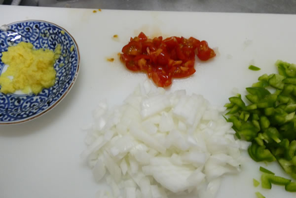 | 3. | ピーマンと玉ねぎは大きめにみじん切りにしておく。トマトも適当な分量をみじん切りにする。 |