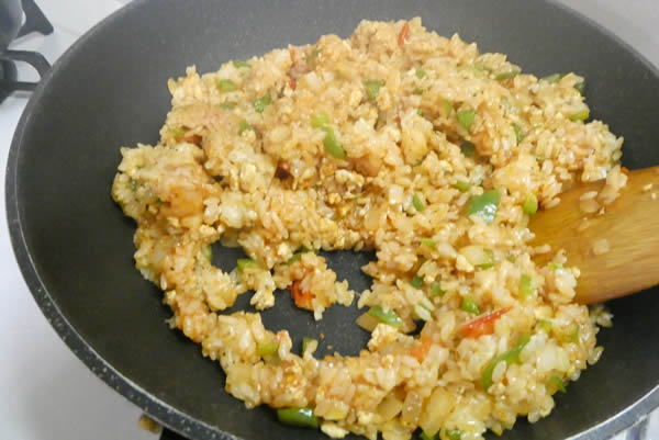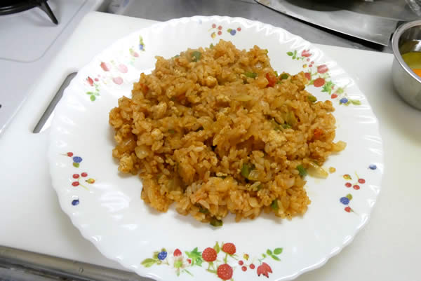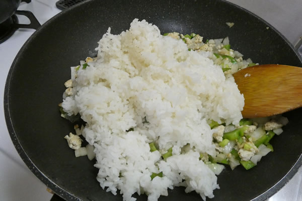 | 5. | 玉ねぎ・ピーマンがちょっとしんなりしたら、ご飯を入れてほぐしながら混ぜ合わせる。 |