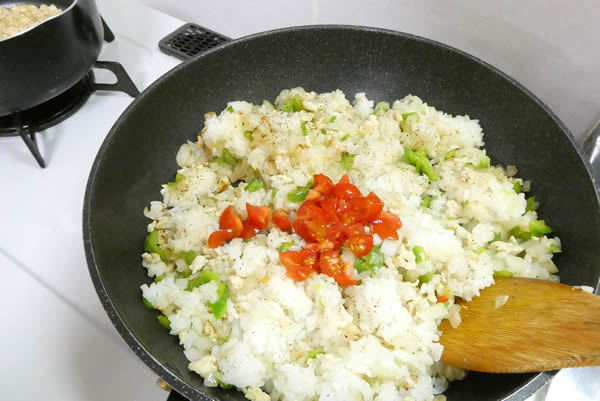 | 6. | バターを溶かし入れて、塩・胡椒・顆粒コンソメで味を整え、トマトのみじん切りを加えて、さらに混ぜ合わせる。 |