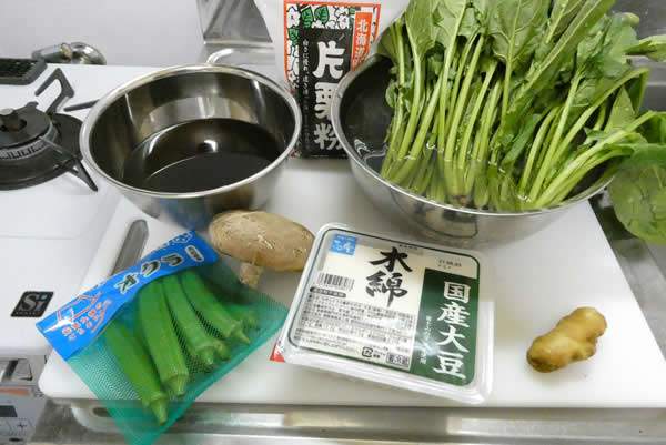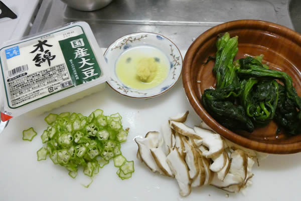 | 2. | ほうれん草を茹で、おくらと椎茸は薄切りにして、生姜をすりおろす。 |