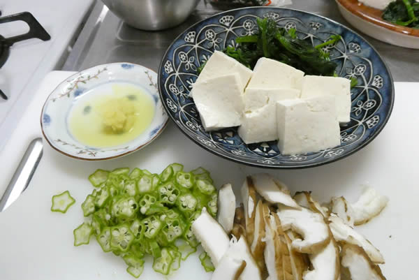 おくらと椎茸を薄切りにします。豆腐は木綿豆腐ですが、別に絹豆腐でもいいでしょう。あんかけで豆腐の歯ざわりを楽しみたいので、取り敢えず木綿豆腐ということで。
