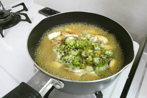 | 3. | 煮汁を熱して、すりおろし生姜を入れ、薄切りにしたおくらと椎茸を加えて少し煮詰め、水溶き片栗粉を流し入れてとろみを付ける。 |