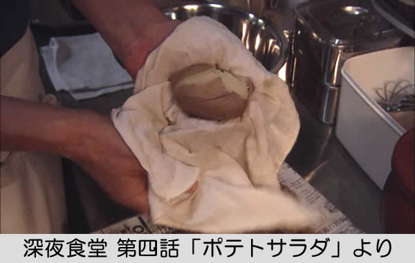 そういえば「深夜食堂」で、マスターがじゃがいもの皮を剥いているシーンがありました。よく来るお客さんの中に、いつも必ずポテトサラダを注文するお客さんがいて、そのための準備のシーンで器用にじゃがいもの皮を剥いていました。