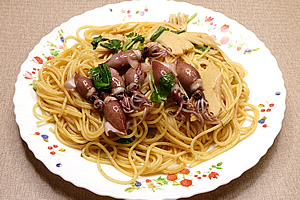 ホタルイカのスパゲティをバター醤油味でまとめてみました。細かく切ったホタルイカと竹の子も混ぜて炒め、三つ葉の風味を生かした、感動のスパゲティです。
