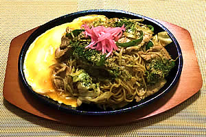 ソース焼きそばを鉄板で。アツアツの焼きそばに、お供は玉子。お肉タップリ、定番の青のりに紅生姜。これはやっぱりビールが進みます。