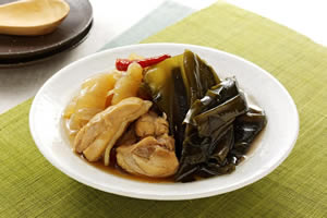 昆布と鶏肉、玉ねぎを加えて煮込みます。鷹の爪でピリッと刺激。トロトロの昆布と玉ねぎでご飯がすすみます!