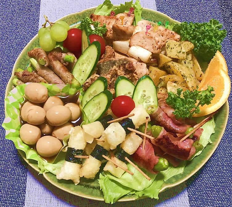 「エビとアボカドの明太子ソースかけ」です。エビは、フライ・バター炒め・ボイルと三種類用意してみました。明太子ソースは生クリームとマヨネーズで和えたものです。