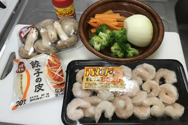 材料はこんな感じ。エビと椎茸は相性がいいので、それをタネにして餃子を作ります。餃子の中身を考えると、やはり水餃子がいいのではないかと。問題はスープ。今回はコンソメ味でいってみます。