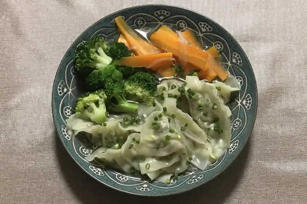 | 8. | 次に、人参を入れ少々煮る。次に玉ねぎと茹でたブロッコリーを入れて、餃子の中身に火が通ったようなら、出来上がり。 |