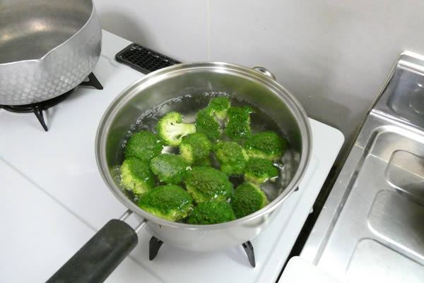 まずブロッコリーを塩茹でします。あとで少し火を通すので、ここは少し硬めに茹でます。