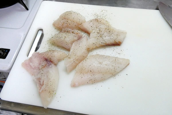 まだらの両面に塩・胡椒を振りかけて、お好みで適当な大きさに切ります
