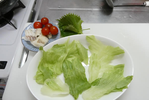 お皿にレタスを敷いて、上に乗せるまだら・ミニトマト・大葉の準備をします。