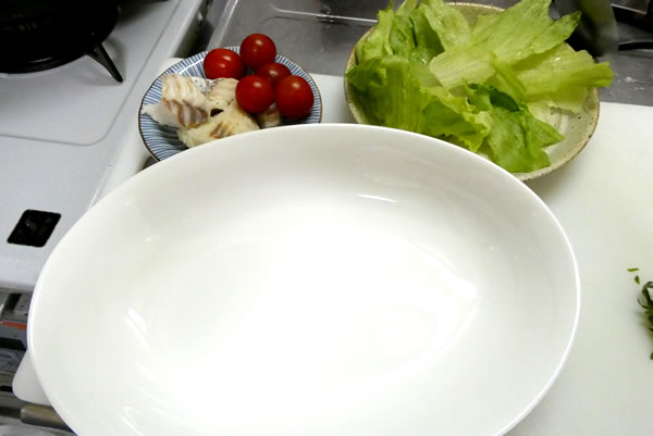 | 6. | 大鍋に湯を沸かして塩を入れ、スパゲティを茹で始め、その間に、お皿に付け合わせの野菜(レタス・ミニトマト)を準備する。 |
