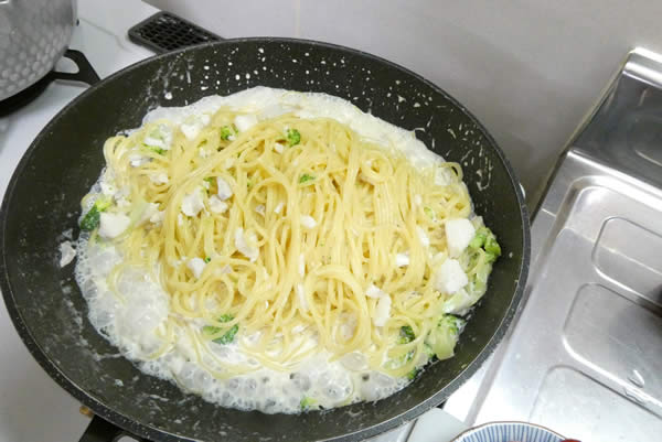 | 7. | スパゲティが茹で上がったら、まだらとブロッコリーの入ったフライパンに麺を移して混ぜ合わせ、お皿に盛り付ける。 |