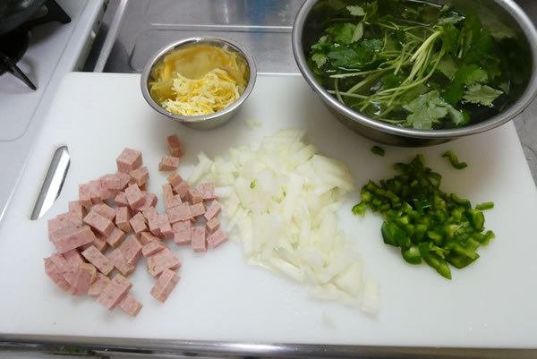 | 1. | SPAMは缶から取り出し、1/4を切り分け、適当な大きさに角切りにする。玉ねぎとピーマンは大き目のみじん切り、三つ葉は適当な大きさに切って水にさらす。 |