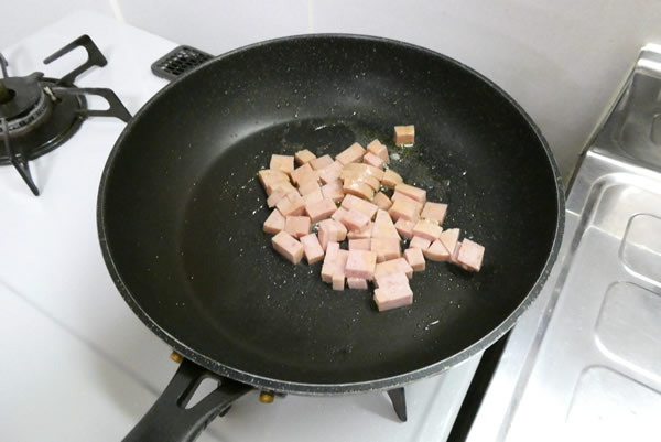 | 2. | フライパンを熱してバターをひき、まずSPAMを炒める。 |