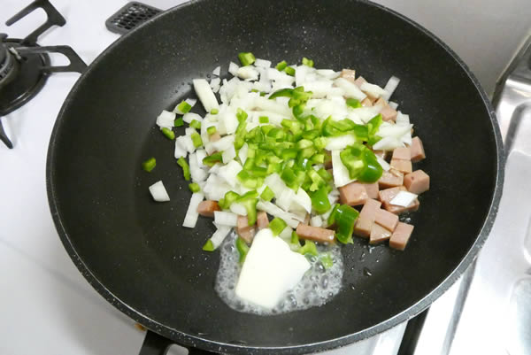 | 3. | 次にピーマン・玉ネギを加えてバターを足して混ぜ合わせる。この時、軽く塩・胡椒を振りかける。 |