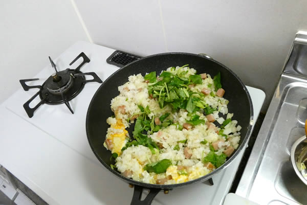 | 4. | 具材が程よく炒まったら、ご飯を足して、ナチュラルチーズを加え混ぜ合わせ、塩・胡椒で味を整える。 |