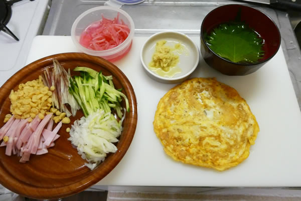 五目ぶっかけの具材を準備します。ロースハム・きうり・みょうが・長ネギを細切り。大葉は水にさらし、生姜をおろし、焼いた平たい玉子を細切りにします。これで下準備完了、至福のひと時です。