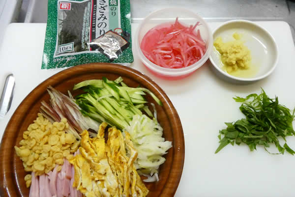 具材のスタンバイOK。大葉も細切りにして、きざみ海苔も参加します。