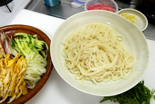 | 5. | ソーメンが茹で上がったら、ざるにあけて水をかけながら混ぜて冷やす。 |