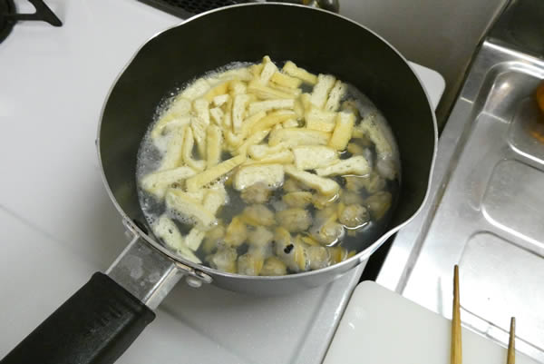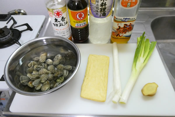 | 1. | 小鍋でアサリを茹でて茹で汁を濾し、アサリは身を取り出しておく。薄揚げは細切りして熱湯をかけて油抜きをする。 |