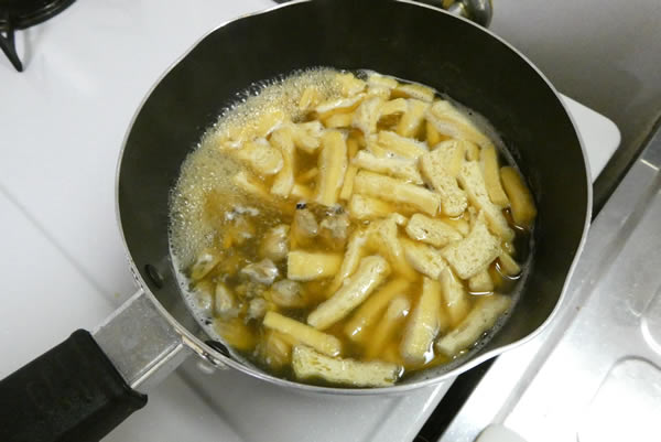 薄揚げは熱湯をかけて油抜きします。最近は油が上質になったので油抜き不要との話もありますが、油っぽさで炒めご飯がしつこくなるとイヤなので、やはり油抜きします。