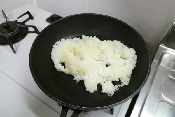 フライパンにごま油をひいて、ご飯を炒めます。